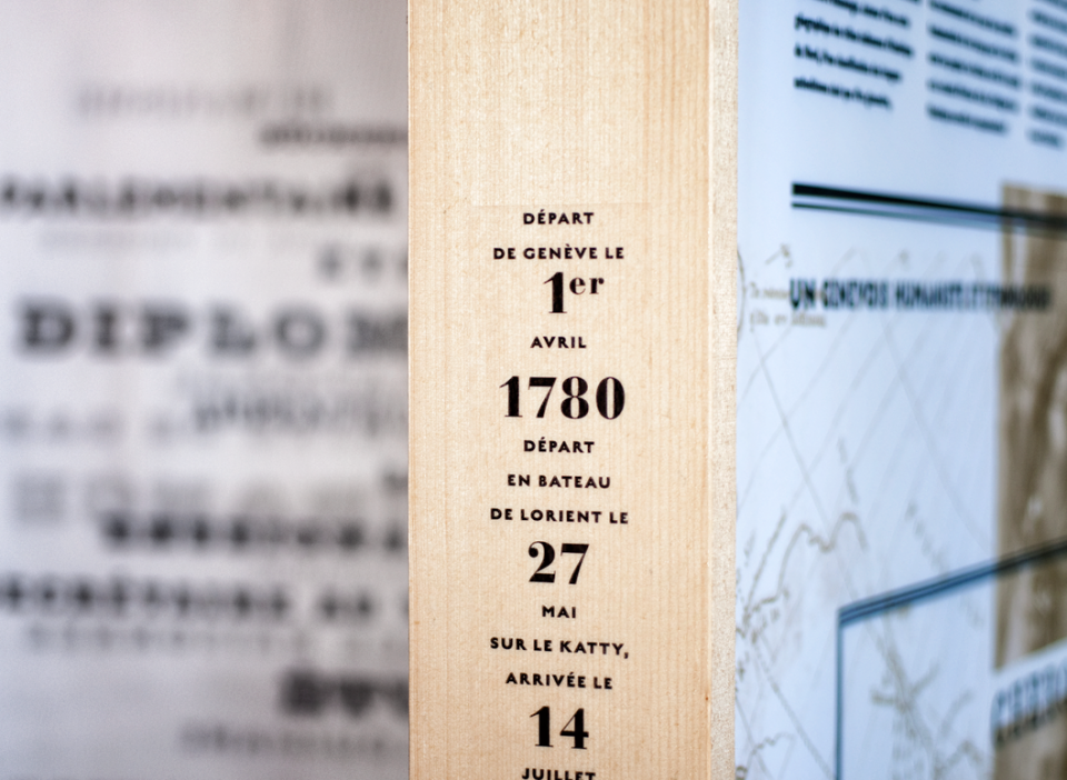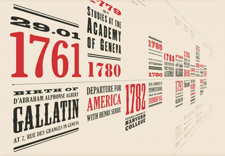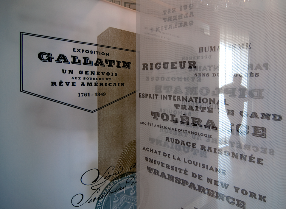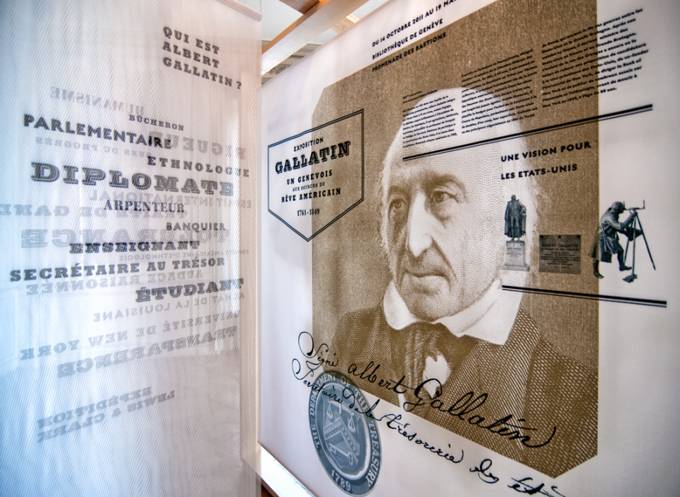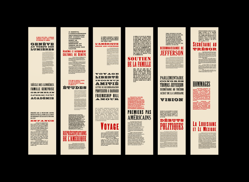 Scénographie de l'exposition itinérante «Albert Gallatin». Bibliothèque de Genève, New York University, Friendship Hill National Park, Pennsylvania.