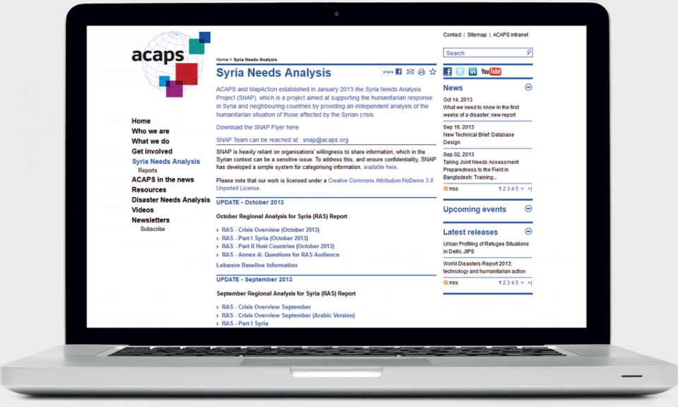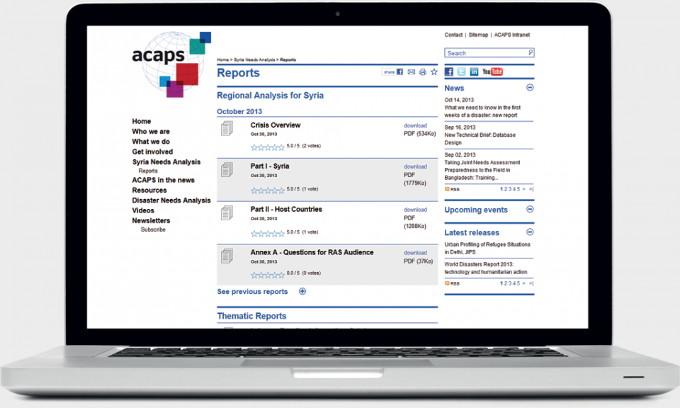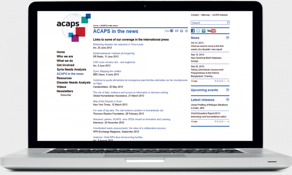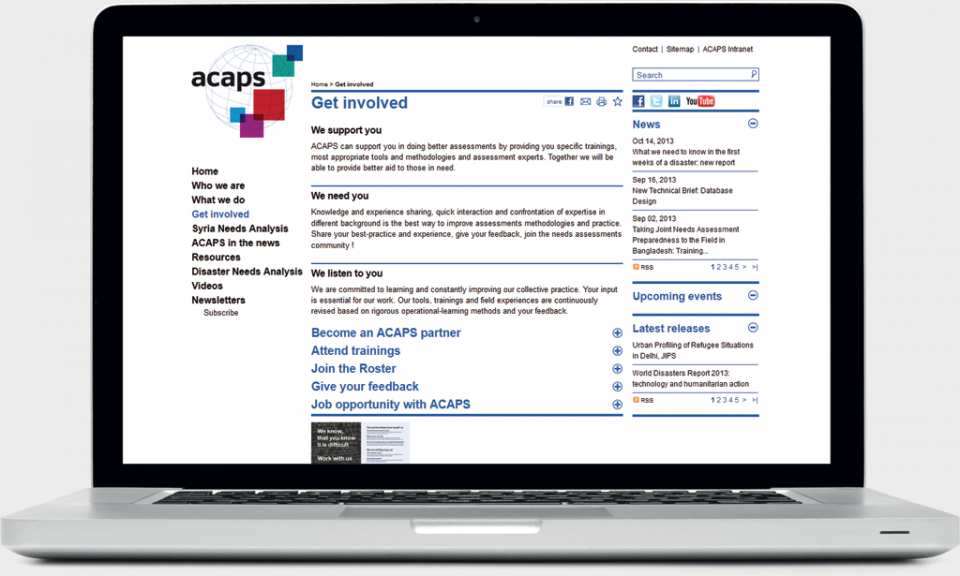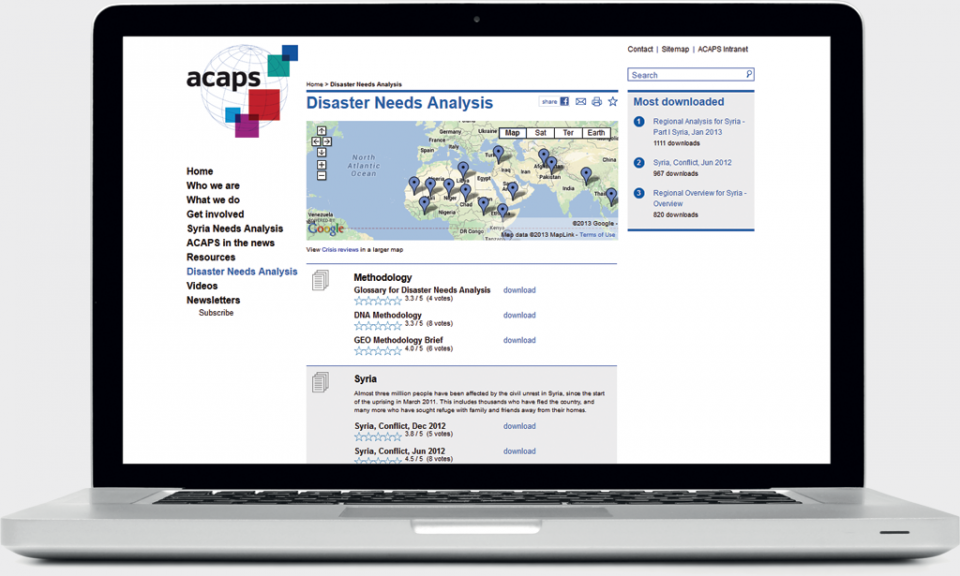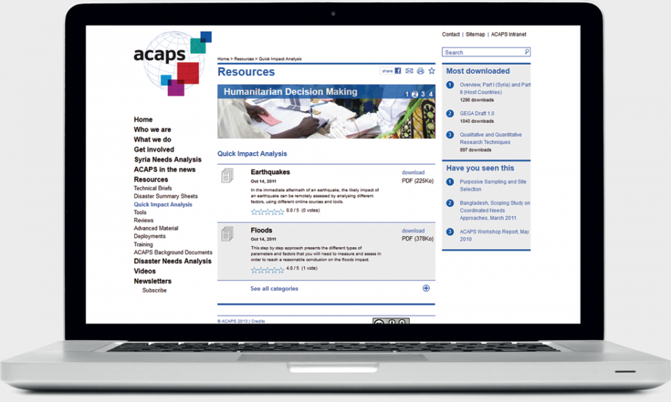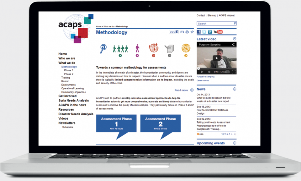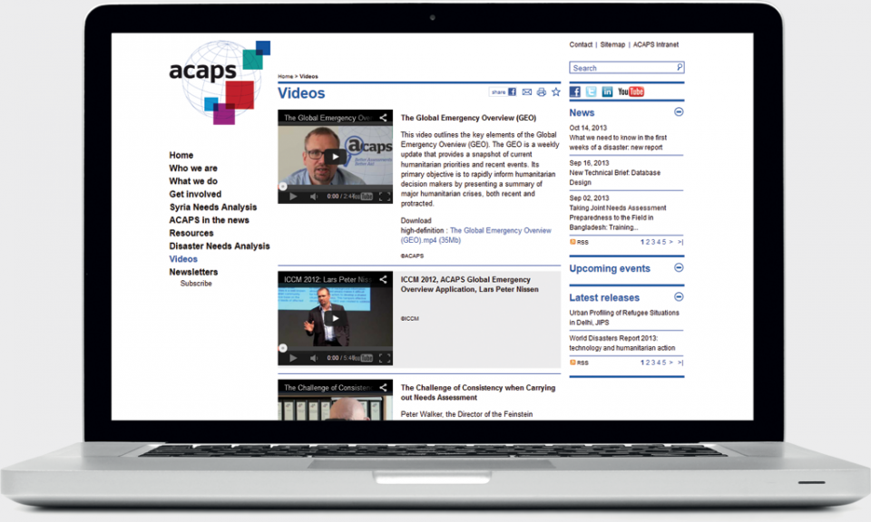 A project to support humanitarian coordinated assessments. Base documentaire, cms, modules de gestion dynamiques sur mesure. Intégration Google Maps et Youtube. www.acaps.org — design séverine mailler