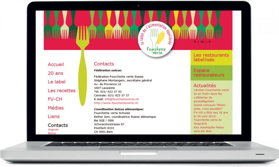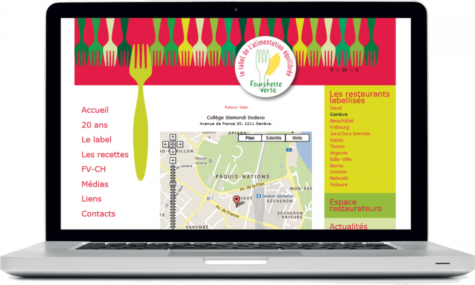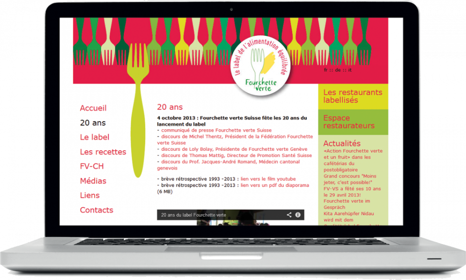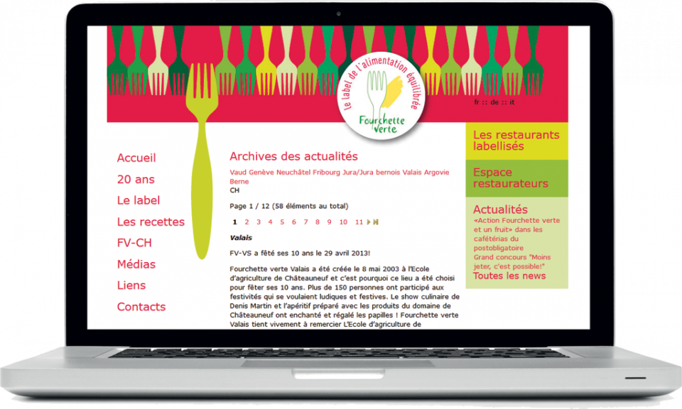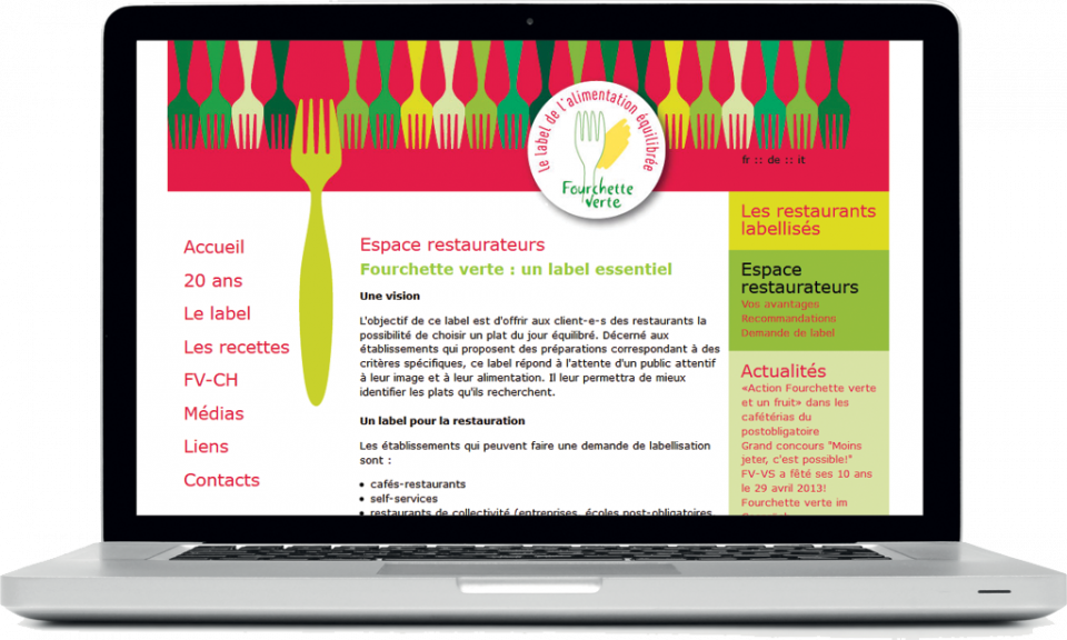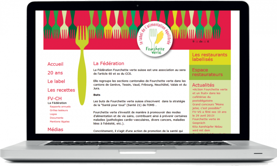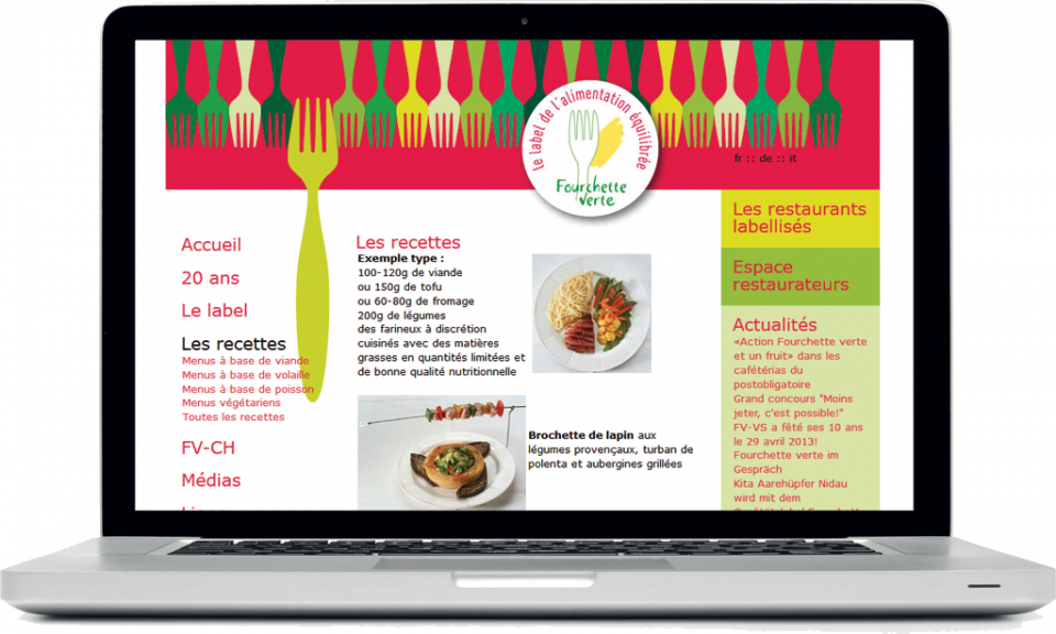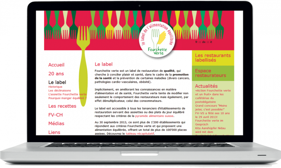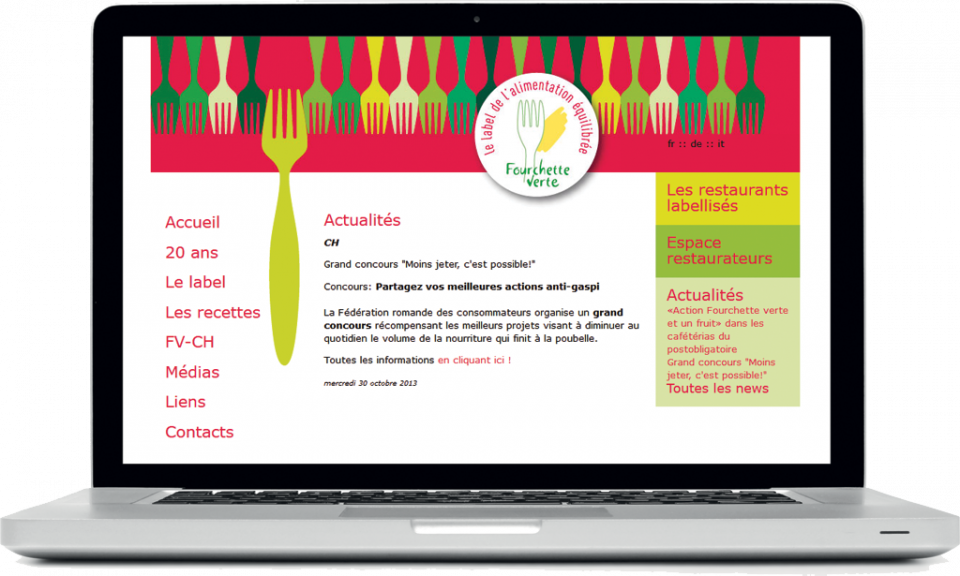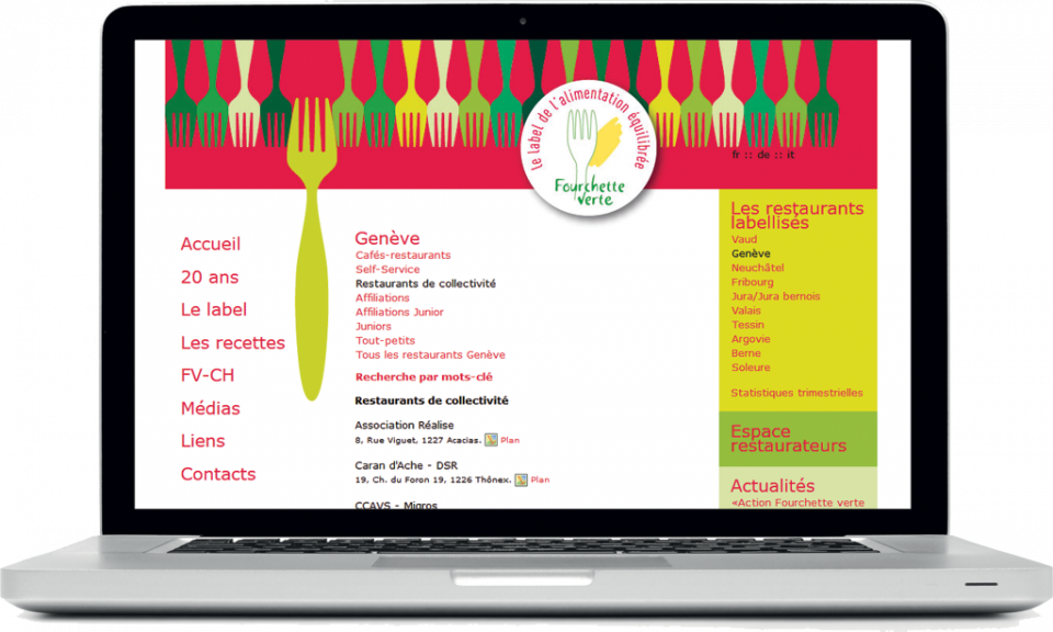 Label de qualité pour la restauration avec répertoire des établissements affiliés, news et informations générales et événementielles. www.fourchetteverte.ch — design françois canellas