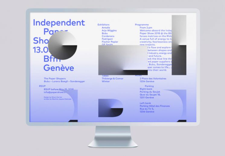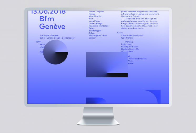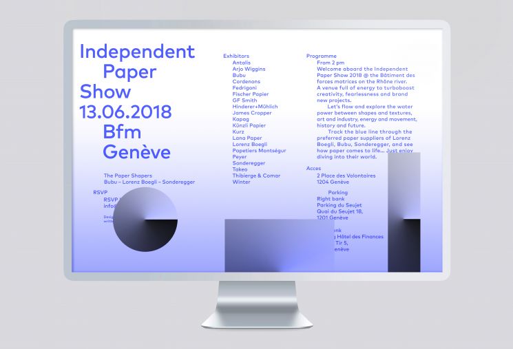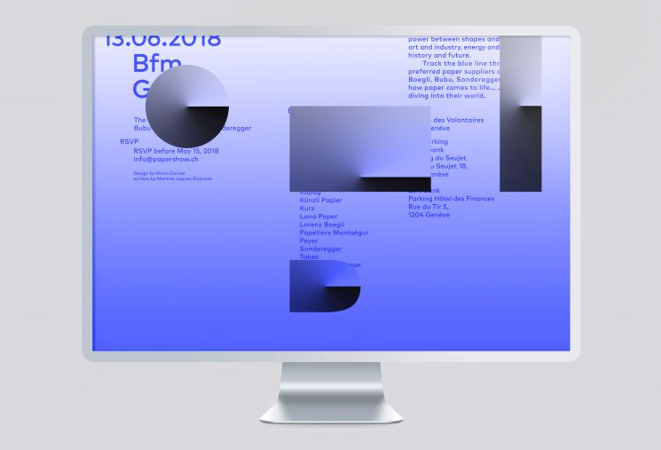 Concept décliné sur l’ensemble des supports de communications suivants : Mail, save the date, invitation, cahier, étiquettes de bouteille d’eau, cabas, scénographie, signalétique, website et motion. Exposants : Antalis, Arjo Wiggins, Bubu, Cordenons, Fedrigoni, Fischer Papier, GF & Smith, Hinderer+Mühlich, James Cropper, Kapag, Künzli Papier, Kurz, Lana Paper, Lorenz Boegli, Papetiers Montségur, Peyer, Sonderegger, Takeo, Winter.